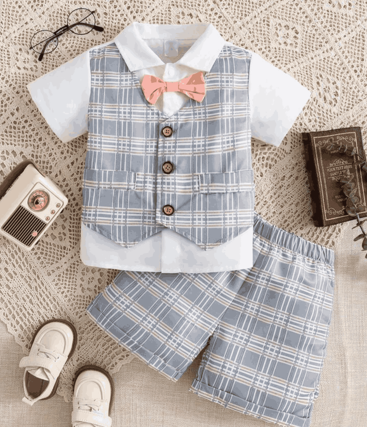 Baby Boy Checkered Colorblock Bow Decoration 2 In 1 Shirt And Shorts Gentleman Outfit