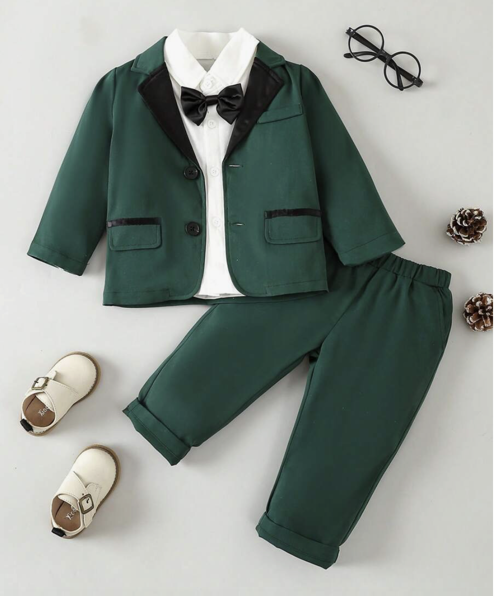 Baby Boy Contrast Collar Bow Front Blazer & Pants & Shirt