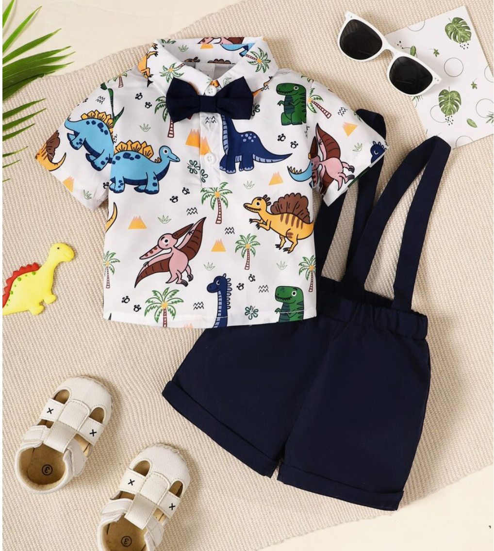 Baby Boy Dinosaur Print Bow Front Shirt & Pinafore Shorts