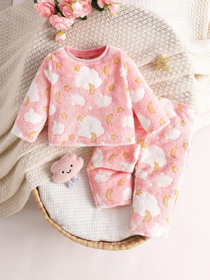 Baby Girl Cute Pink Plush Cloud & Moon Patterned Long Sleeve Top And Pants Homewear Pajama Set, Autumn/Winter