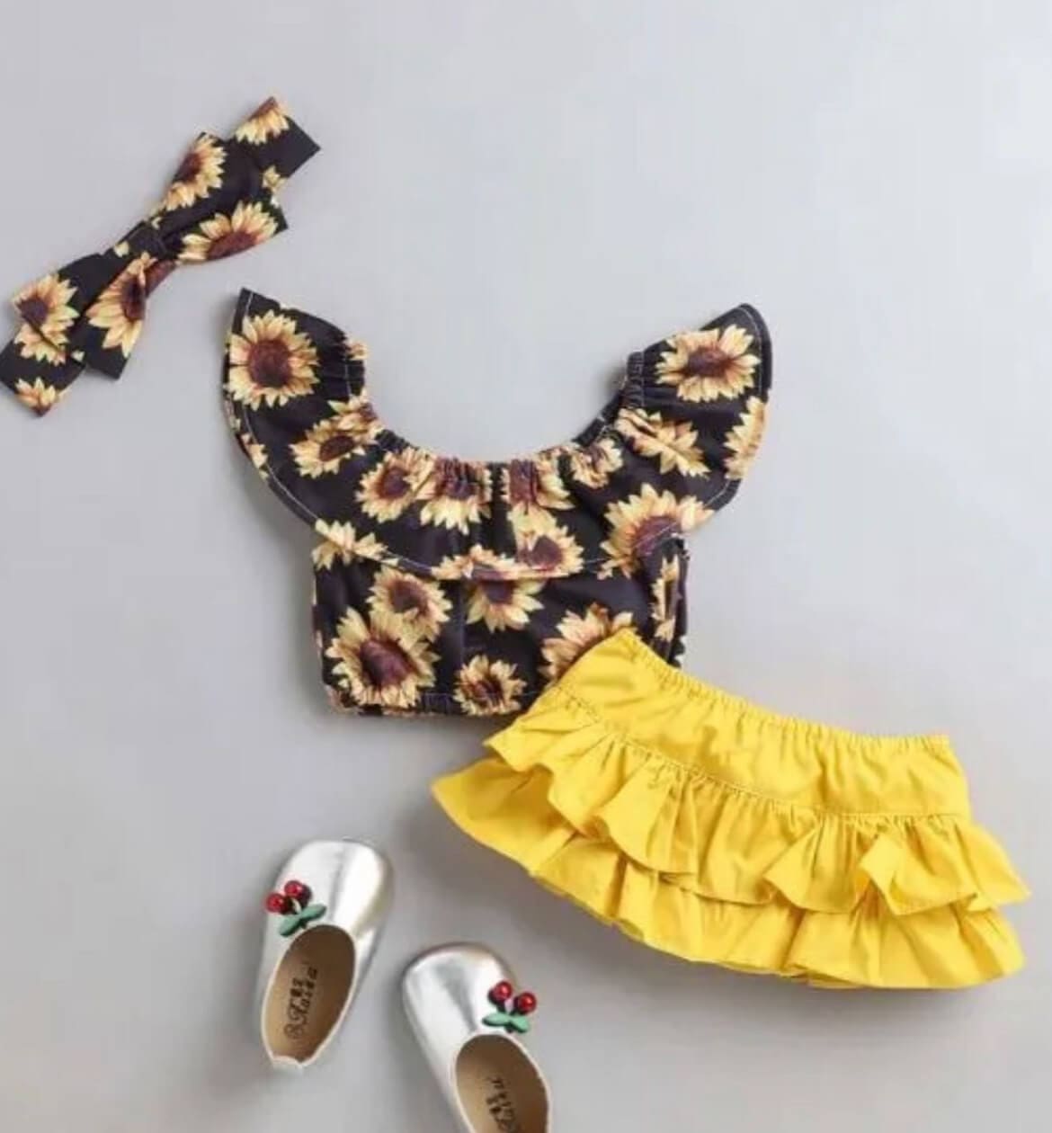 Girls Black Floral Print Blouse And Skirt Set with Headband