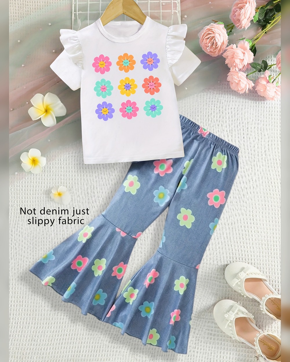 Girls flowres printed white t-shirt and long pant (2pcs)