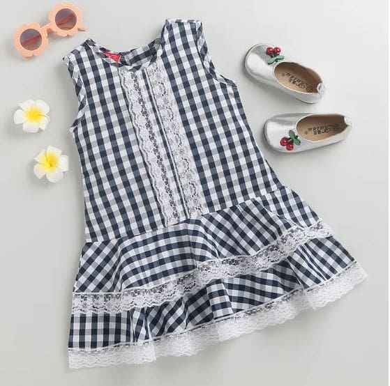 Girls Navy Sleeveless Checkered Casual Dress
