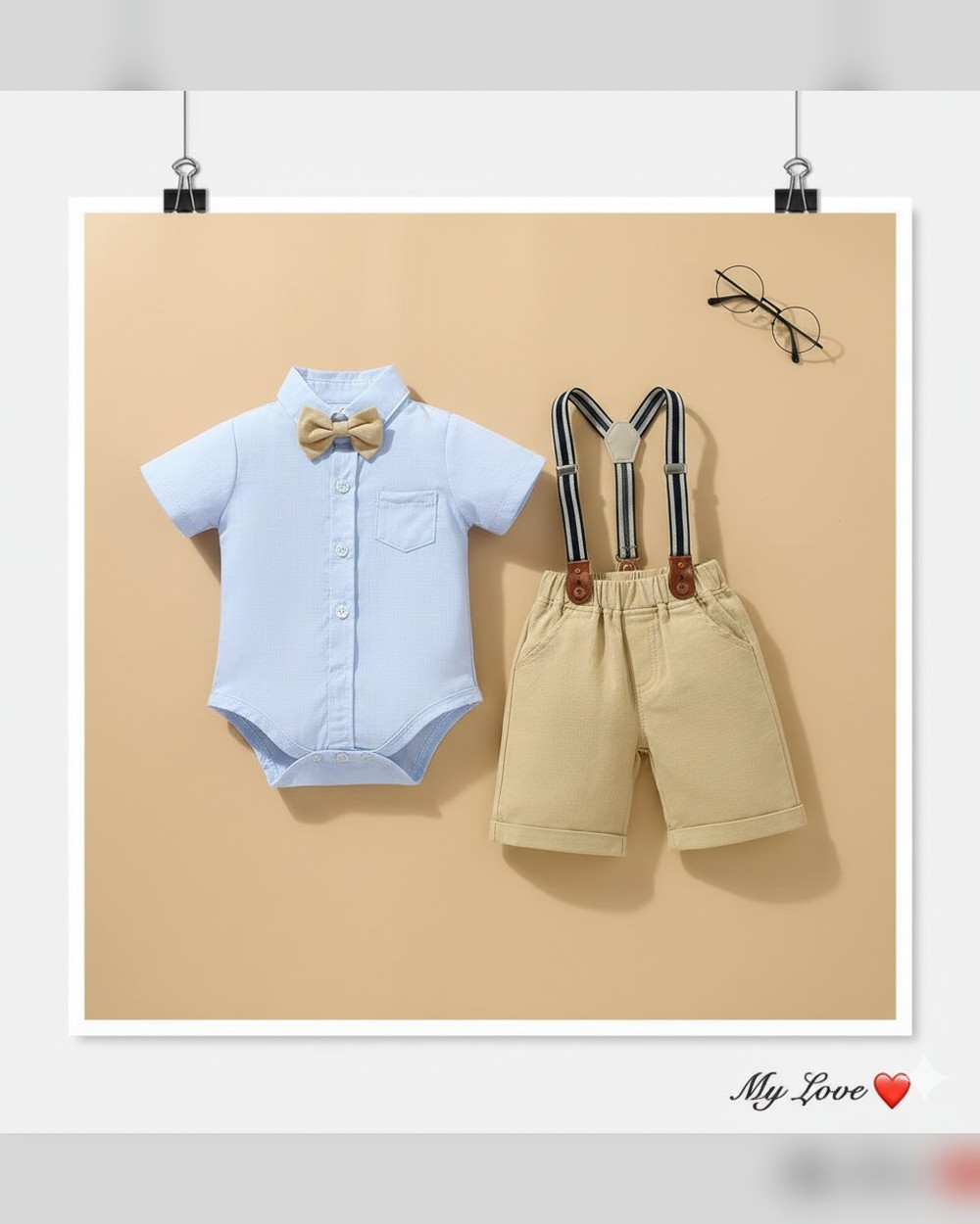 Light Blue Shirt & Beige Bow Suspender Shorts Baby Set