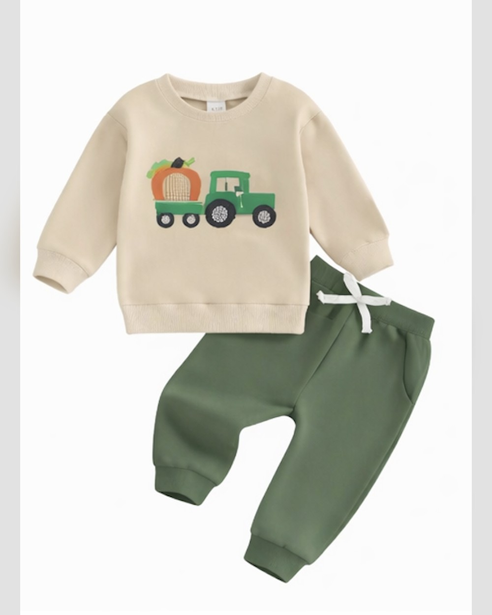 Neutral Beige & Olive Truck Print Baby Sweatshirt and Jogger Set
