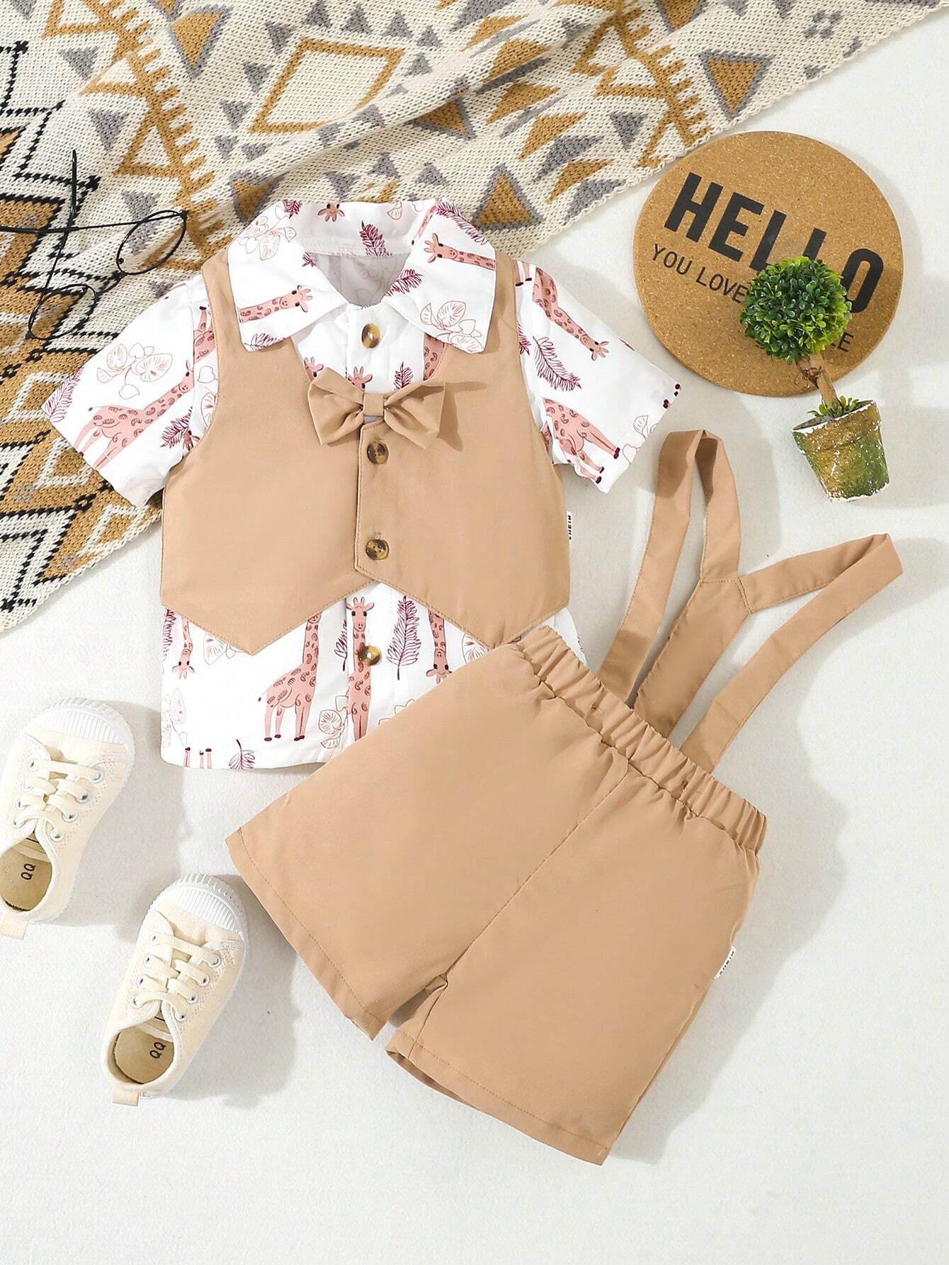 pcs/Set Baby Boys’ Elegant Academy Retro Gentleman Outfit, Including Animal Print Shirt, Khaki Shorts And Vest, Suitable For Diverse Outfits And Occasions