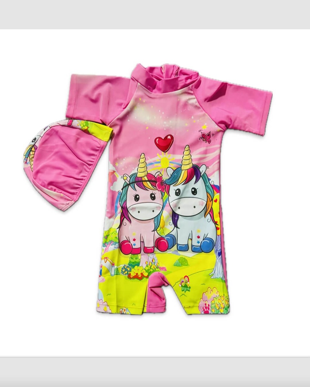 Pink Unicorn printed Girls with sleeve swim wear with cap