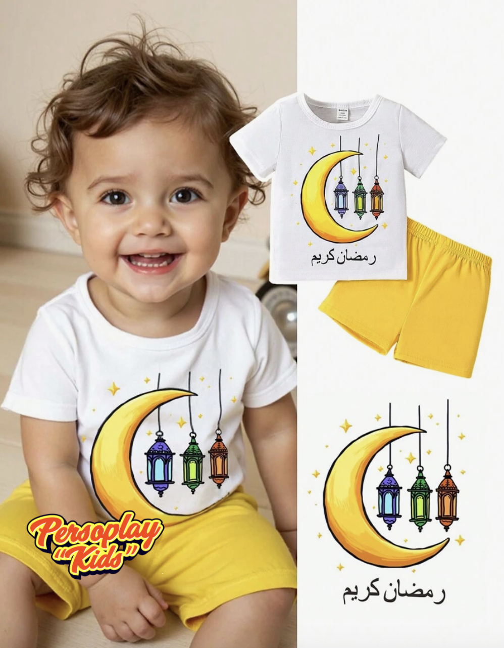 Ramadan 2pcs Toddler Infant Baby Boys Star & Moon Lantern Pattern Round Neck Short Sleeve T-Shirt And Shorts Set, Suitable For Summer,Ramadan Decor,Ramadan Kids,Ramadan Outfit, Islamic Clothi