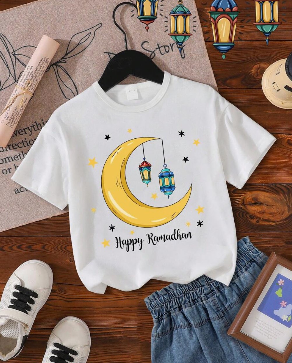 Ramadan Crescent Moon Print Short Sleeve Casual Cute T-Shirt, Spring/Summer
