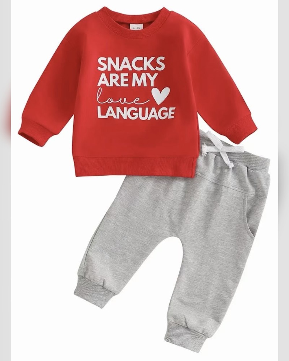Rust Red & Grey “Snacks Are My Love Language” Baby Sweatshirt and Jogger Set