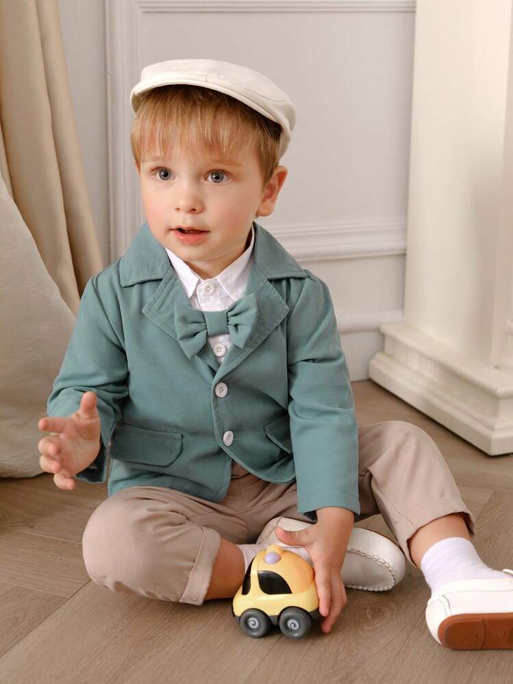 Souflis 3pcs Baby Boys’ Vintage French Style Suit, Including Jacket, Shirt, And Overalls, Suitable For Outdoor Activities In Autumn And Winter