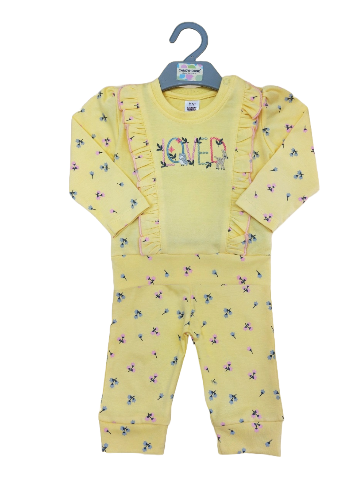 Yellow long sleeves and pants featuring a print of small blue flower and the word loved embroidered on the t-shirt (2pcs)