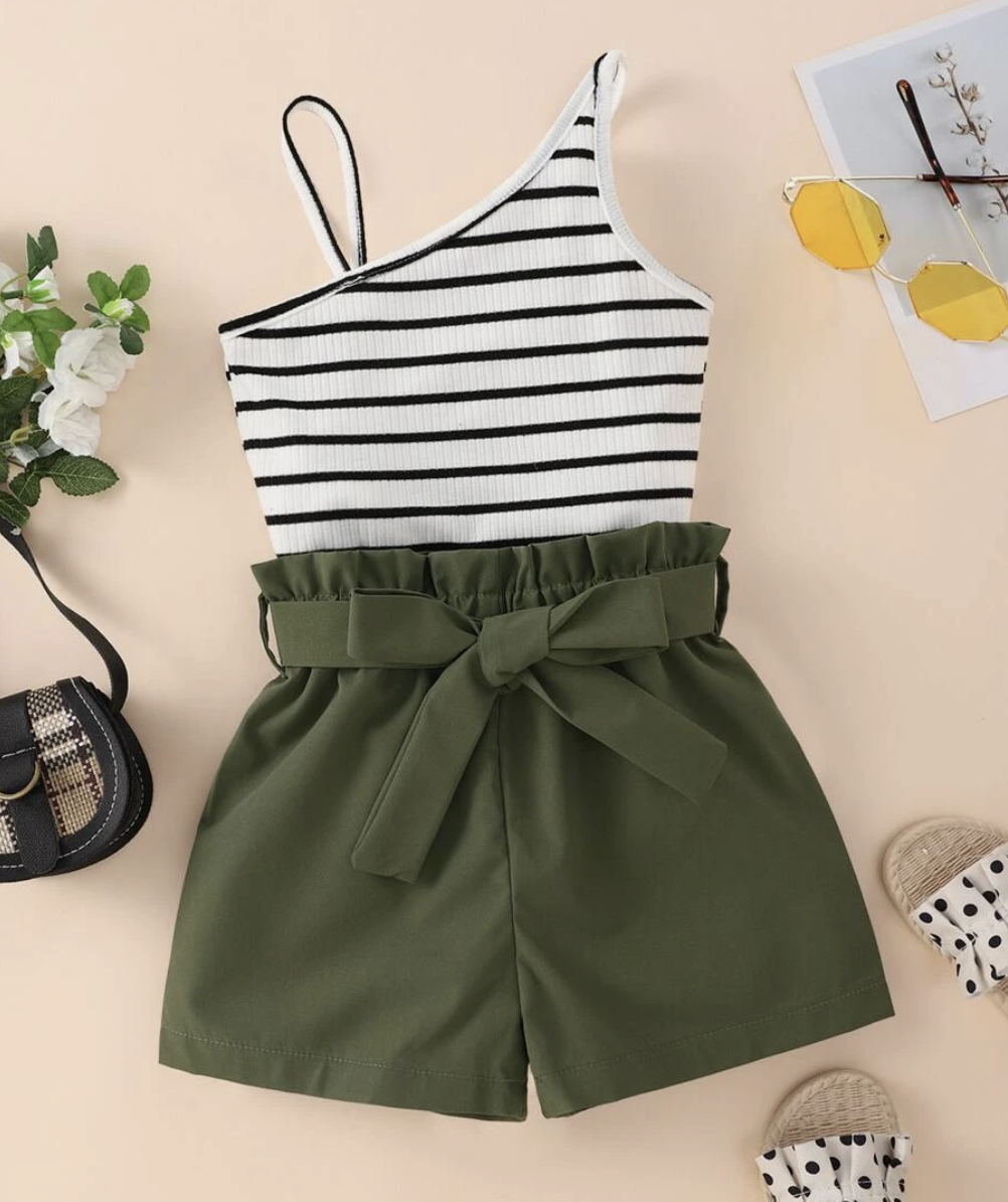 Young Girl Striped Asymmetrical Neck Top & Paperbag Waist Belted Shorts